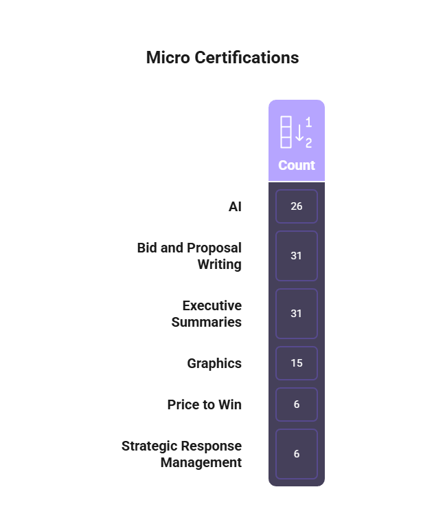 These micro-certifications are open to all professionals in the bid and proposal field, with no prerequisites required. They provide a flexible way to enhance your expertise and demonstrate your commitment to best practices in the industry.